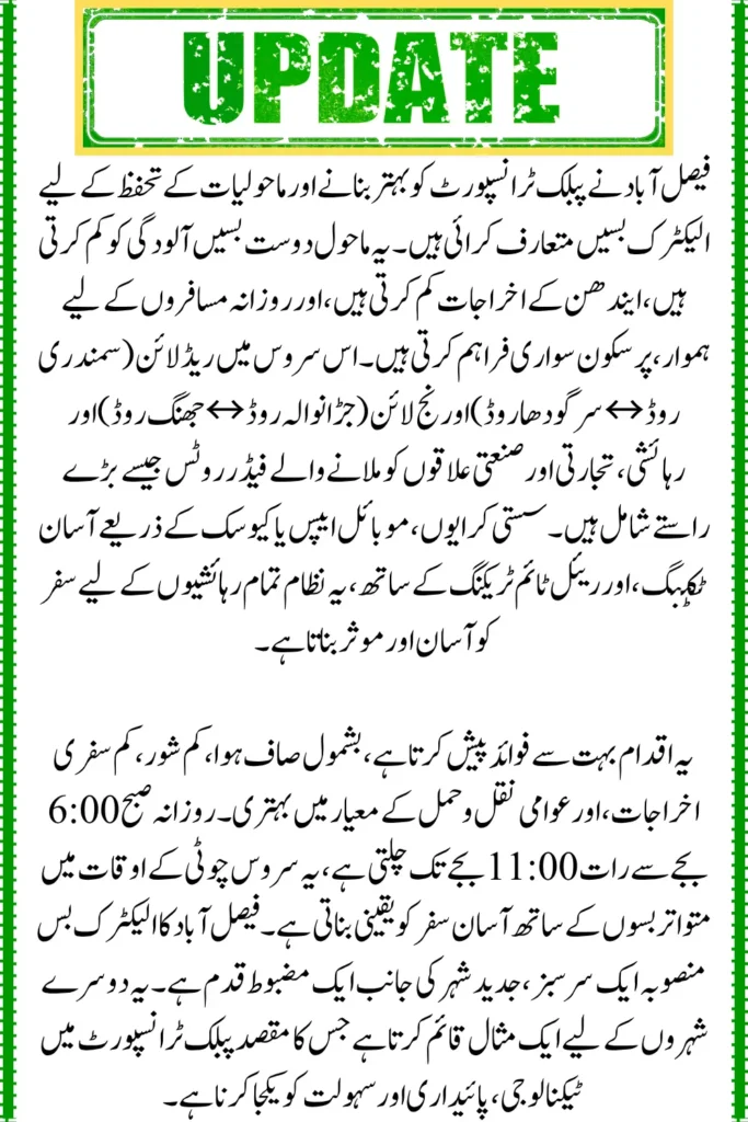 This initiative improves air quality, reduces traffic noise, and supports a sustainable future. Faisalabad sets an example for other cities by combining technology, convenience, and environmental care. Electric buses are not just transport they are a step toward a cleaner, greener city.