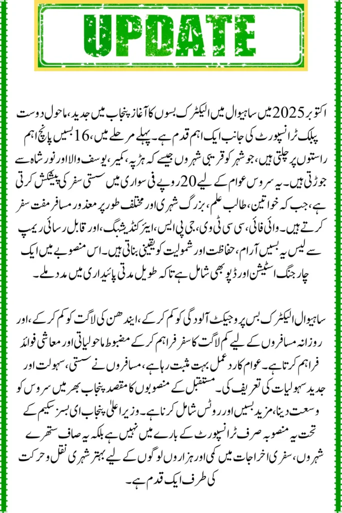 The launch of electric buses in Sahiwal marks a new beginning for public transport in Punjab. These buses provide affordable, safe, and eco-friendly travel for thousands of passengers every day. With a fare of only Rs 20 for the public and free rides for women, students, senior citizens, and disabled persons, the service ensures inclusivity and relief for families. Modern facilities like Wi-Fi, CCTV, GPS, ramps, and air conditioning make travel more comfortable and secure for everyone.