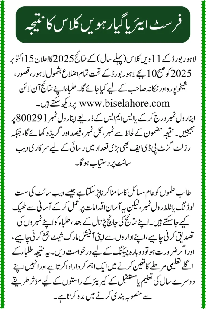 The Lahore Board 1st Year/11th Class Result 2025 is scheduled for release on October 15, 2025, at 10:00 AM. This announcement applies to all districts under the Lahore Board, including Lahore, Kasur, Sheikhupura, and Nankana Sahib. Students can access their results online by visiting the official Lahore Board website at biselahore.com and entering their roll number or full name. Additionally, results can be checked via SMS by sending your roll number to the Lahore Board’s official code: 800291. For those who prefer offline access, the result gazette will be available in PDF format on the official website.