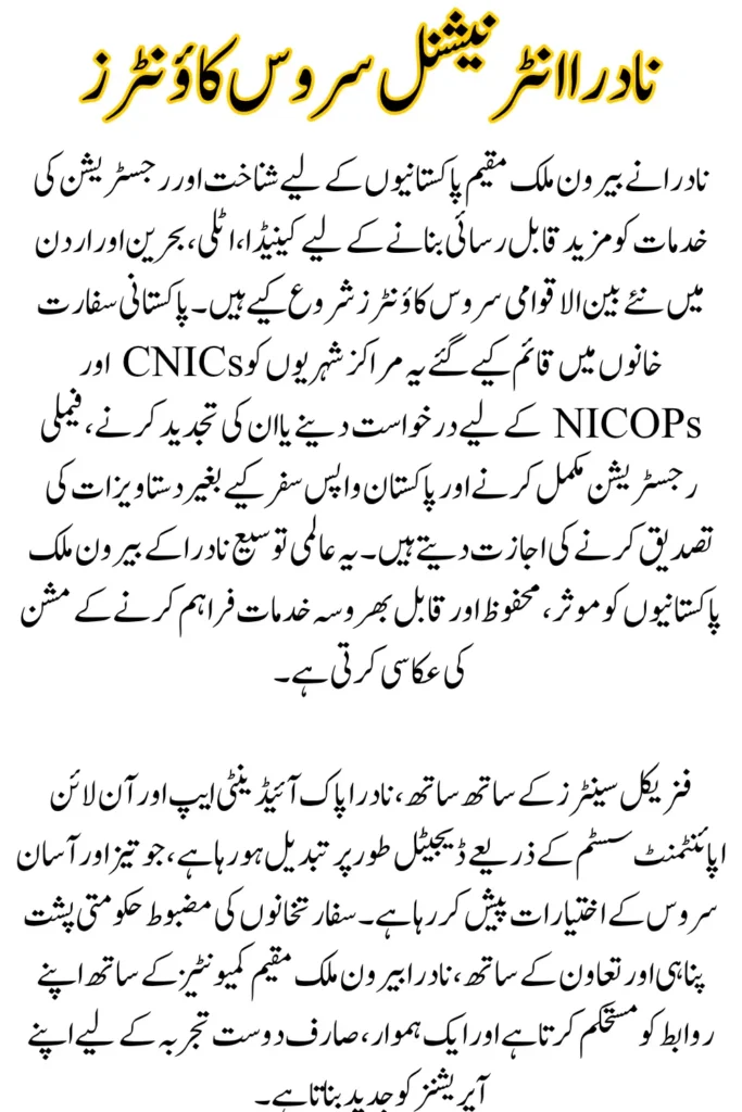 - Easy Access: Overseas Pakistanis can now access NADRA services without traveling back to Pakistan.