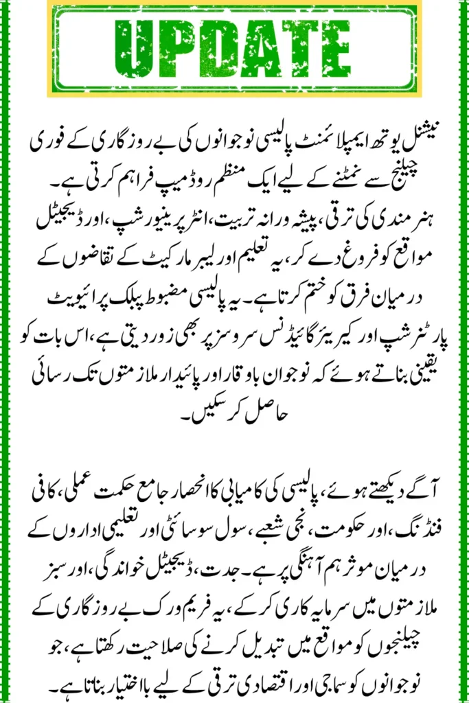 Youth unemployment remains one of the most pressing challenges of our time, affecting not only individual livelihoods but also national development and social stability. The National Youth Employment Policy provides a structured framework to address these challenges by promoting skills development, entrepreneurship, digital opportunities, and stronger partnerships between stakeholders. By focusing on both immediate and long-term solutions, the policy aims to empower young people to contribute meaningfully to the economy and society.