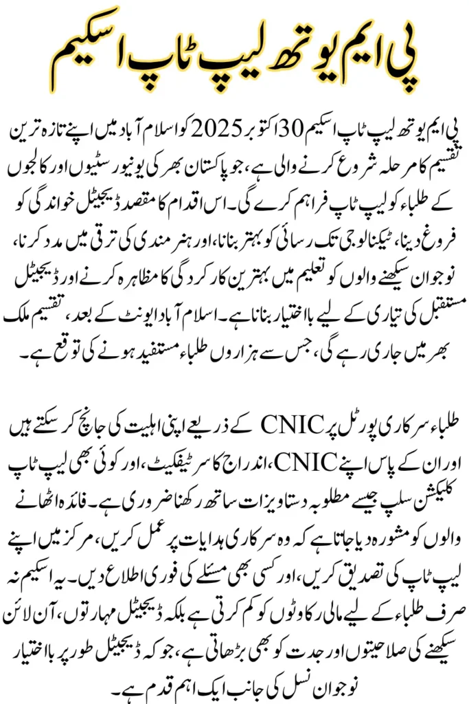 The Prime Minister’s Youth Free Laptop Distribution Scheme is launching a new distribution phase starting on 30th October 2025 in Islamabad. Students from universities and colleges will receive laptops to support their education and skill development. This initiative aims to promote digital literacy, improve access to technology, and empower young learners across the country. The Islamabad event will feature senior government representatives and students from various institutions.