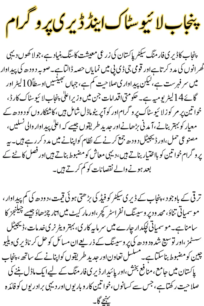 The Livestock Card program in Punjab provides farmers with interest-free loans to support dairy farming. It aims to boost productivity, improve farm income, and empower small-scale farmers and women. The process is fully digitized for easy access and transparency.