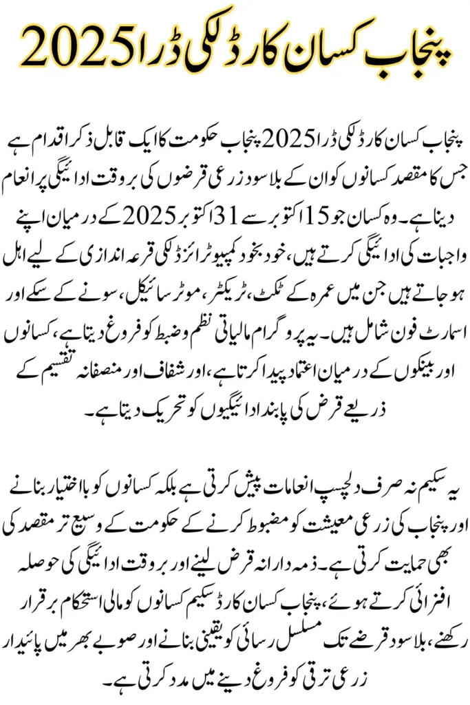- Eligibility for the Kisan Card Lucky Draw 2025 with prizes like tractors, Umrah tickets, and smartphones.