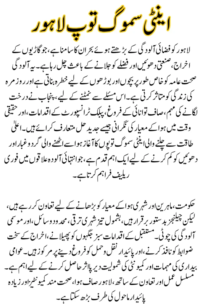 Lahore’s air pollution is a serious challenge affecting health and daily life. The government, experts, and citizens are taking steps to reduce emissions and improve air quality. Initiatives like anti-smog cannons, green energy, and awareness campaigns show progress.