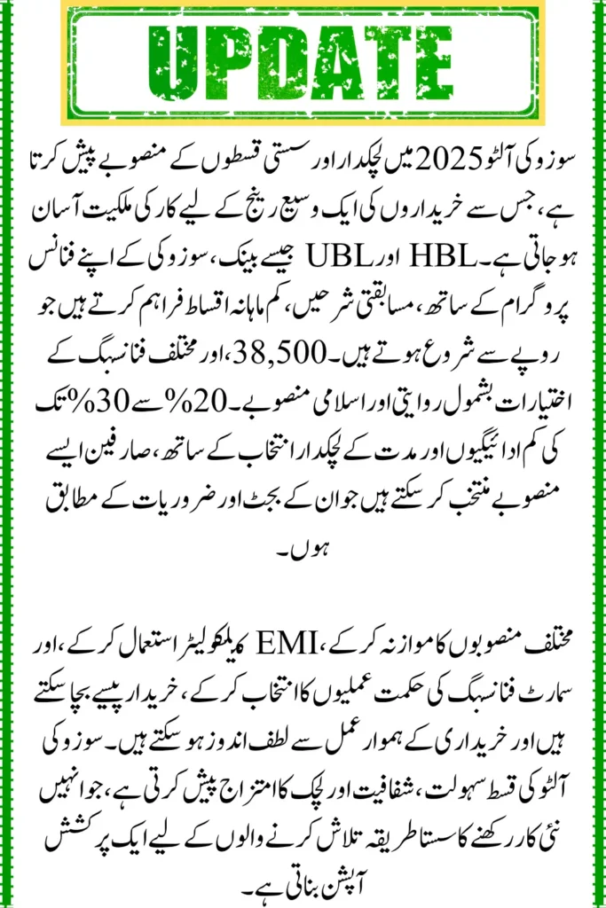 The Suzuki Alto 2025 comes with attractive installment plans. Banks like HBL and UBL offer low monthly payments and flexible terms. Buyers can choose from conventional or Islamic financing with down payments from 20% to 30%. These plans make owning an Alto easy and budget-friendly.